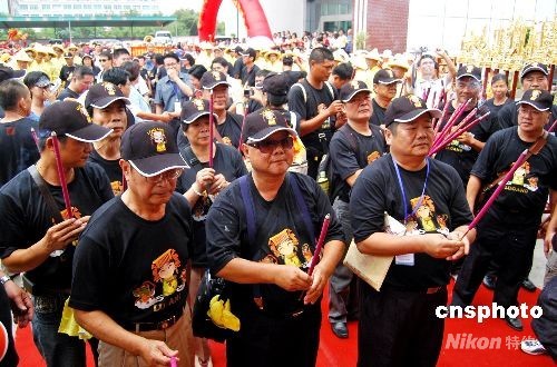 九月五日中午,臺灣鹿港天后宮進(jìn)香團(tuán)的三百多名媽祖信眾由金門分兩批乘船抵達(dá)泉州石井對臺客運(yùn)碼頭,進(jìn)行為期五天的謁祖進(jìn)香活動(dòng)。 這是鹿港天后宮開基媽祖一百九十一年后重回大陸謁祖。據(jù)介紹,鹿港天后宮媽祖,是三百多年前施瑯將軍從福建引請到臺灣的。曾于清嘉慶二十二年(一八一七年)在鹿港八郊人士護(hù)送回湄洲祖廟謁祖,迄今已一百九十一年,這次再回祖廟會(huì)香,見證兩岸媽祖神緣。圖為鹿港進(jìn)香團(tuán)在石井碼頭舉行祭拜儀式。 中新社發(fā) 傅丹丹 攝
