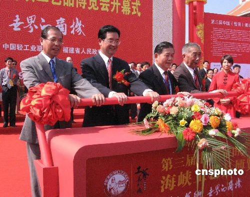 十月二十九日,由國臺辦、中國輕工業(yè)聯(lián)合會和福建省人民政府主辦的第三屆海峽工藝品博覽會在福建莆田市工藝美術(shù)城揭幕,薈集了來自兩岸五百多家知名企業(yè)的近萬件海峽兩岸工藝精品。圖為兩岸嘉賓共同推動博覽會開幕推桿。 中新社發(fā) 張彩林 攝