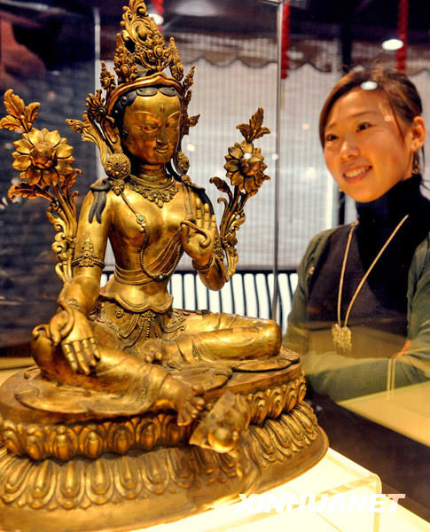 2月6日,市民在精品展上參觀清代文物《銅鎏金綠度母》。新華社記者 張國俊 攝
