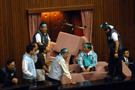2009年2月20日:臺灣行政部門主管劉兆玄在臺灣“立法院”新會期的第一場“施政報告”,民進(jìn)黨“立委”大陣仗迎接,要求劉兆玄要為了經(jīng)濟(jì)問題道歉。民進(jìn)黨“立委”的抗議行動導(dǎo)致劉兆玄無法上臺,經(jīng)過6個多小時的混亂,下午3點劉兆玄才得以上臺宣讀“施政報告”,并且因為綠營“立委”不斷阻撓,劉兆玄的報告只進(jìn)行了6分鐘就匆匆結(jié)束。《全文》