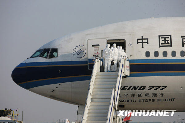 飛機在上海浦東機場平安著陸后,?吭809號遠機位,浦東機場和檢驗檢疫局等部門立即選派專業人員,按照國家質檢總局的程序和上海市的要求,對飛機和旅客進行防疫消毒,首先上飛機對旅客和機組健康狀況進行全面掌握,確認機上人員健康無異常后,才組織旅客下飛機和卸下行李貨物,上海市有關部門按照規定隨即對乘機旅客進行隔離觀察。南航對飛機內外進行全面清潔消毒,嚴密處理客艙垃圾污水并集中焚毀。由國家衛生檢驗檢疫部門對飛機衛生狀況全部驗收合格后,飛機預計將于19時左右從上海起飛,空機飛回廣州。