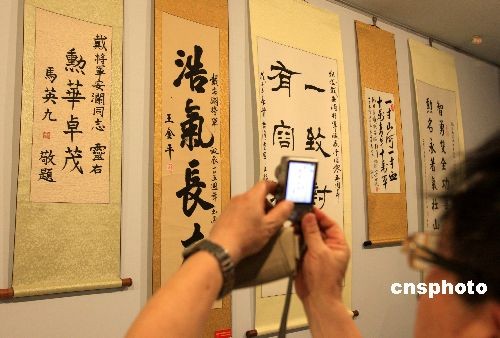 7月4日,“紀(jì)念戴安瀾將軍誕辰一百零五周年——海峽兩岸書畫交流邀請(qǐng)展”在上海緊張布展,一幅臺(tái)灣地區(qū)領(lǐng)導(dǎo)人馬英九專程送展的親筆手書“勛華卓茂”引人注目。該展覽將于5日開幕,展出書畫作品三百五十幅,其中臺(tái)灣地區(qū)作品八十幅,當(dāng)中還有不少兩岸知名人士“重量級(jí)”展品。 中新社發(fā) 潘索菲 攝