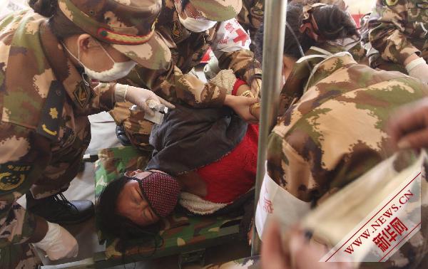 4月17日,一名剛被救出不久的結(jié)古鎮(zhèn)傷員被送到武警青海總醫(yī)院臨時救助點接受治療。青海玉樹地震發(fā)生以來,來自解放軍、武警部隊醫(yī)院的多支軍醫(yī)救護(hù)隊在玉樹搭建起臨時救助點對災(zāi)區(qū)傷病員進(jìn)行搶救和治療,成為災(zāi)區(qū)生命的救助站。新華社發(fā)(郭國權(quán) 攝)