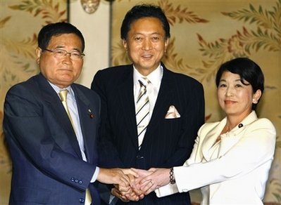 (左起)日本國民新黨代表龜井靜香、民主黨代表鳩山由紀夫、社民黨黨首福島瑞穗9日在國會就聯合執(zhí)政達成協議。