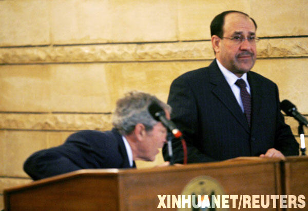 2008年12月14日,在伊拉克首都巴格達(dá)舉行的記者會(huì)上,美國前總統(tǒng)布什(左)彎腰躲避襲擊。當(dāng)日,一名伊拉克記者在布什與伊拉克總理努里·馬利基(右)召開的聯(lián)合新聞發(fā)布會(huì)上脫下自己的鞋,扔向布什。 新華社/路透
