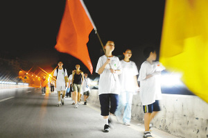 8月8日凌晨4點(diǎn),白天喧囂的洋人街一片靜悄悄。數(shù)十名男女身穿統(tǒng)一的T恤,手拿礦泉水瓶,堅(jiān)定地朝前走。頭天深夜從大禮堂出發(fā),沿兩路口、長江大橋,到南濱路、彈子石洋人街,他們已走了一個(gè)通宵。