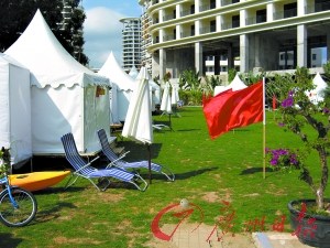 高端酒店咬定高價(jià)不放松,中低端酒店在亦步亦趨的同時(shí)還不忘廣開財(cái)源。在三亞灣,有酒店就推出體驗(yàn)式帳篷,期待招徠客源。記者在三亞度假村酒店看到,這家酒店的草坪上,15頂白色帳篷已經(jīng)搭起,里面不僅配備了床,水電也一應(yīng)俱全,每個(gè)帳篷內(nèi)還配備了環(huán)保廁所。