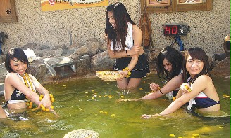 “您可以與金棗共浴!”宜蘭縣礁溪鄉川湯春天溫泉飯店推出“金棗湯”,增加泡湯樂趣,業者還邀辣妹編了“金棗操”,把落山風、西北雨等融入舞姿,帶游客健康跳一下。