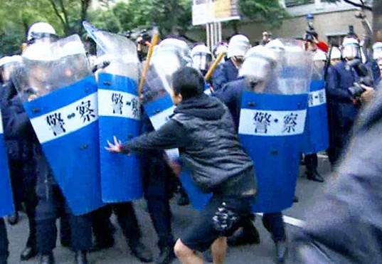 學生肉身撞盾牌,不肯驅(qū)離鎮(zhèn)暴警察直接逮捕。(臺媒圖)