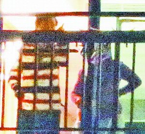 陳水扁(左)5日晚在看護陪同下,拄著柺杖走出陽臺看夜景。