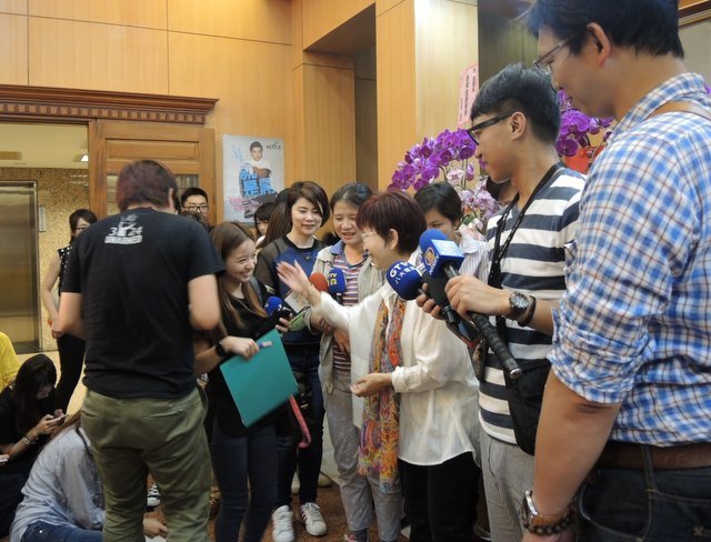 每天都有大批媒體要采訪洪秀柱,媒體堵訪差一點站不起來,洪要幫忙扶。(中評社 黃筱筠攝)