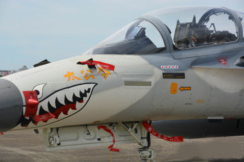為紀念對日抗戰勝利七十周年,臺防務部門于新竹空軍基地舉行“空軍紀念圖騰彩繪戰機”媒體參訪活動。在F-16戰機機身展示彩繪,復刻二戰時期“飛虎隊”鯊魚頭涂裝,機身上可見“太公令”字樣與5面日本國旗,象征擊落的5架日機,并紀念已故抗戰英雄徐華江將軍。(臺媒圖)