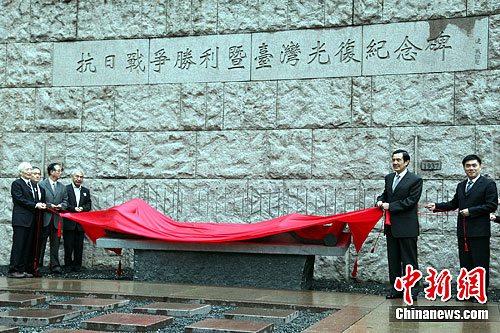 資料圖:2011年10月25日,臺灣地區領導人馬英九在臺北中山堂外廣場為“抗戰勝利暨臺灣光復紀念碑”碑文落成揭幕。右二為馬英九。(中新社發 陳立宇 攝 )