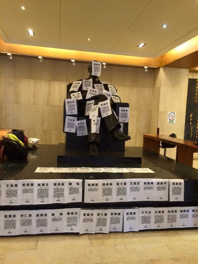 政大野火陣線2月28日在圖書館中的蔣介石銅像上張貼海報(bào),后遭駐警隊(duì)撕除。(圖片來源:臺(tái)灣“中時(shí)電子報(bào)”)