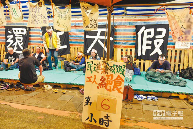中國臺灣網11月6日訊 據臺灣《中國時報》報道,蔡當局力推“一例一休”,傳出解套曙光。仍在“立法院”外絕食抗爭的勞工團體表示,在野黨所關注的事情,與勞工要爭取的權益根本是兩件事。因此,無論如何,勞團的態度還是傾向保留7天法定假日,而非用增加特休假的方式去湊足全年123天休假日,呼吁國民黨與“時代力量”別只關心程序問題。