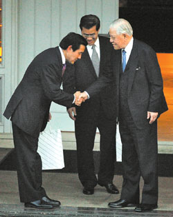 前臺灣地區領導人馬英九(左一)與前臺灣地區領導人李登輝(右一)握手并向李登輝鞠躬(圖片來源:臺灣“中國時報”)