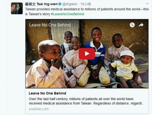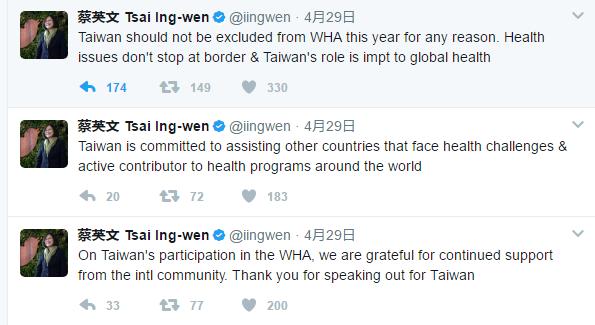 為求世衛大會門票,蔡英文4月29日首度推特發文,向國際“喊話”。(圖片來源:網站截圖)