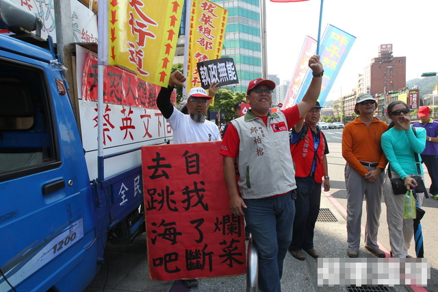 中國臺灣網6月10日訊 臺當局領導人蔡英文今出席臺海巡單位2017年“世界海洋日暨海安九號演習”,上午抵達基隆,卻遭到“臺灣退伍軍人權益保障協會”團體嗆聲,成立“拔菜總部”欲替天行道。據臺媒報道,抗議群眾在文化中心廣場嗆聲,要求“爛菜下臺”,并打出要“爛菜”“自我了斷,去跳海吧”的抗議紙板,警方則在旁警戒。