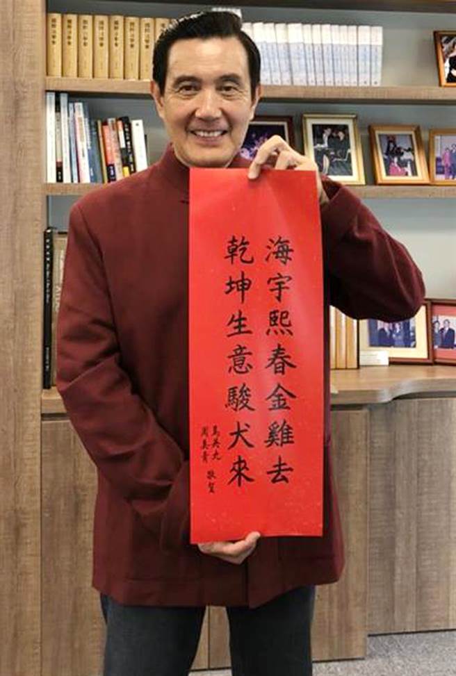 馬英九親筆狗年春聯(lián),“海宇熙春金雞去,乾坤生意駿犬來”,還有妻子周美青雙重祝福。(圖片來源:臺(tái)灣《中時(shí)電子報(bào)》)