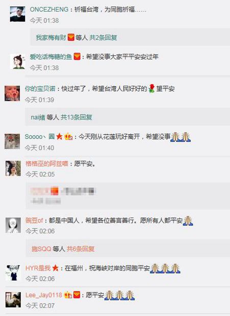 此外,在眾多的祈福帖中,還有一種令人無法忽視的溫暖聲音,那就是“同胞之情”。當如今的臺灣被“臺獨”勢力染指時、當一小部分臺灣民眾被蔡英文當局所謂的“臺灣價值”洗腦時,大陸網友則是在大災面前溫情喊話:臺灣與大陸是同胞,希望同胞平安!