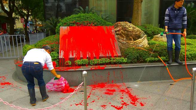 “統派”團體“中華統一促進黨”霸先黨部主委陳清峰,不滿日本以水砲驅逐臺灣海釣船,到“日本臺灣交流協會”朝石碑潑灑紅漆抗議。(圖片取自臺媒)