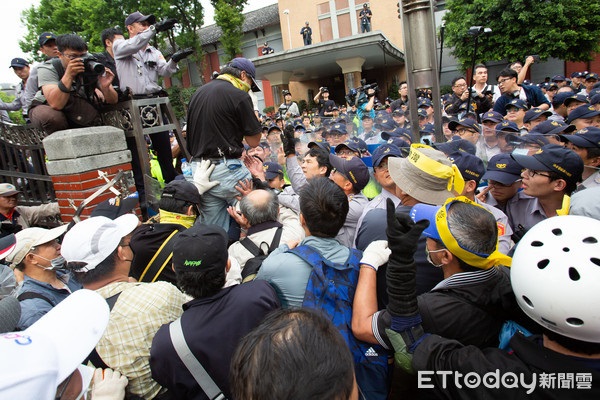 報(bào)道說,“八百壯士”行隊(duì)伍下午3點(diǎn)30分行經(jīng)臺(tái)“立法院”大門時(shí),群眾大喊前進(jìn),部分退役特戰(zhàn)翻過戒備闖入“立法院”,其他人則以麻繩拉開大門,并扔擲剪刀、保溫瓶、塑料椅等物品!鞍税賶咽俊痹噲D綁上繩索拉倒鐵門,但警察用刀子及剪刀割斷繩索,雙方對(duì)峙約兩小時(shí)。