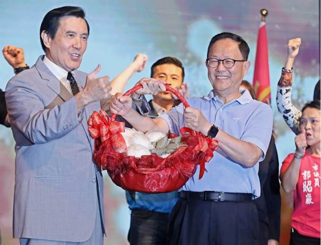 馬英九(左)25日在國民黨臺北市長參選人丁守中(右)等人陪同下,出席臺北市工商婦女會挺丁守中后援會成立大會,馬并致贈象征好兆頭的包子、粽子給丁,祝他高票當(dāng)選。(圖片來源:臺灣《中時電子報》)