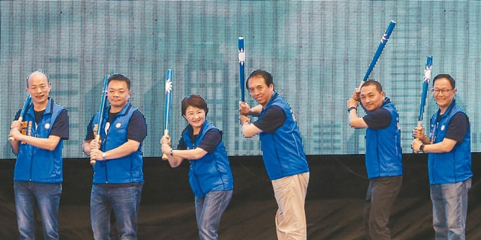 國民黨“六都”市長參選人韓國瑜(左起)、高思博、盧秀燕、陳學圣、侯友宜、丁守中化身選手,做出揮棒動作,期許打出漂亮的勝選全壘打。(圖片來源:臺灣《聯(lián)合報》)