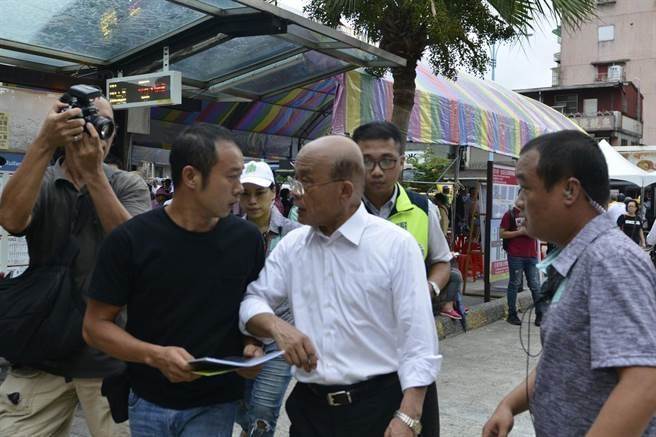 面對陳志強的陳情,蘇貞昌眼神十分銳利,將手用力地觸碰陳志強。(圖片來源:臺灣“中時電子報”)