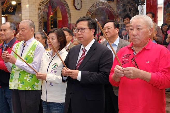 桃園市長鄭文燦(前排右二)26日在八德指玄宮祈福謝票。(圖片來源:臺灣“中時(shí)電子報(bào)”)