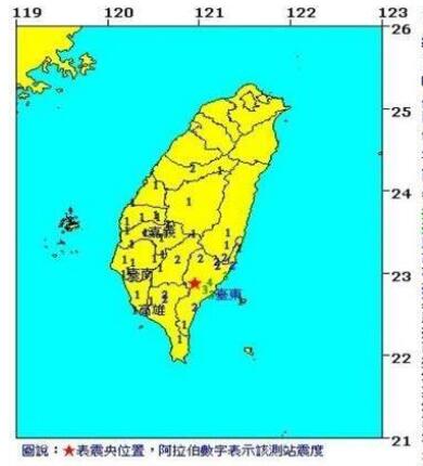中國臺灣網(wǎng)1月4日訊 據(jù)臺灣“中時電子報”報道,臺灣地區(qū)今天(4日)凌晨2點02分發(fā)生4.7級(中國地震臺網(wǎng)測定為4.4級)地震,震中在臺東縣政府西北方23.3公里、臺東縣延平鄉(xiāng),地震深度5公里。臺東縣鹿野震度4級搖最兇,玉山也有感,無重大災(zāi)情傳出。