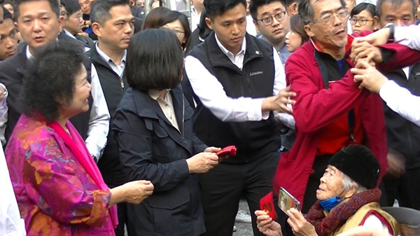 蔡英文接著到廟前廣場(chǎng)發(fā)紅包,又有一名抗議男子推著坐輪椅的老婦人,混在領(lǐng)紅包的人群中。他趁接近蔡英文時(shí),掏出一根預(yù)藏的麥克風(fēng),高喊“錯(cuò)誤就要改正”。安全人員立即上前架離他。(中國臺(tái)灣網(wǎng) 李寧)