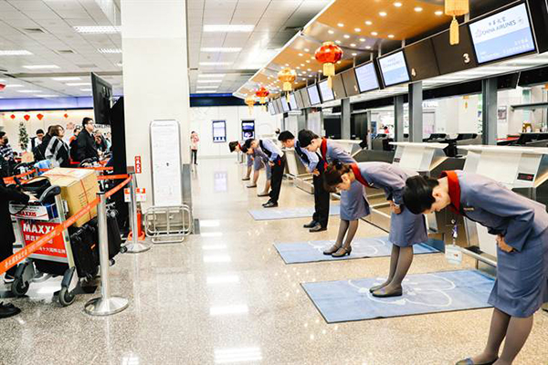 圖為臺灣松山機場華航柜臺,服務人員向旅客鞠躬敬禮。(圖片來源:中時電子報)