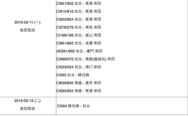 華航公布11日取消航班分別為CI031溫哥華-臺北、CI052悉尼-臺北、CI064維也納-臺北、CI076羅馬-臺北。下午新增的23航班分別為:CI601/602臺北-香港來回、CI915/916臺北-香港來回、CI923/924臺北-香港來回、CI278/279臺北-高松來回、CI188/189臺北-釜山來回、CI861/862臺北-金邊來回、AE991/992臺北-廈門來回、CI069/070臺北-倫敦(蓋威克)來回、CI523/524臺北-海口來回、CI063臺北-維也納、CI839/84高雄-曼谷來回、CI933/934高雄-香港來回。12日CI064維也納-臺北航班也遭取消。