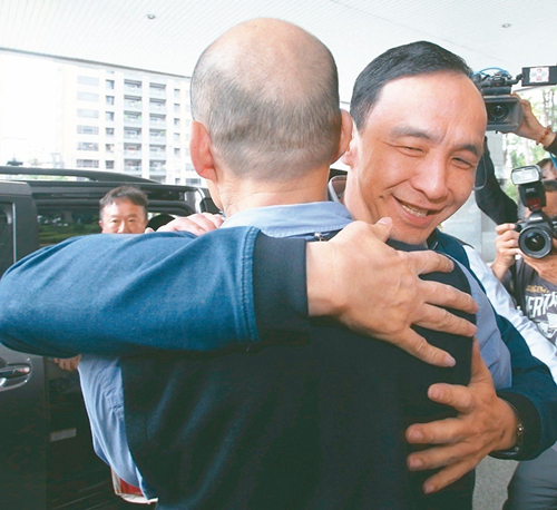 朱立倫(右)昨天南下拜會韓國瑜(左),朱立倫特地給韓國瑜一個大擁抱。(圖片來源:臺灣《聯合報》)