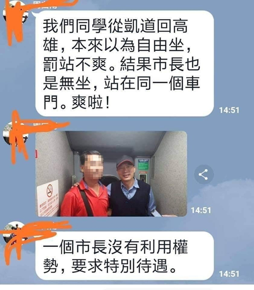 網(wǎng)友發(fā)韓國瑜搭高鐵照贊親民。(圖片取自臺(tái)媒)