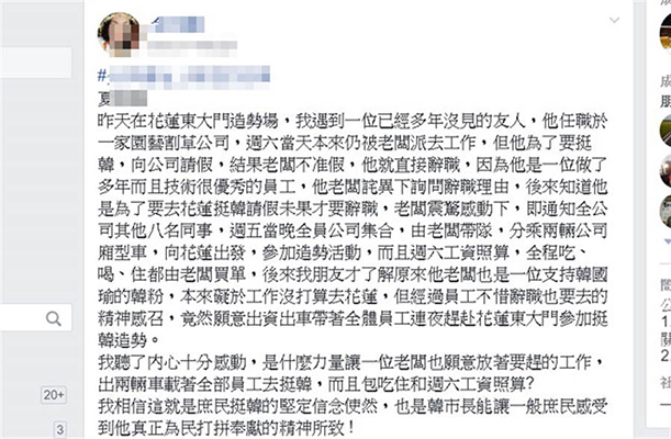 網友在臉譜網(facebook)分享:“昨天在花蓮東大門造勢場,我遇到一位已經多年沒見的友人,他任職于一家園藝割草公司,周六當天本來仍被老板派去工作,但他為了要挺韓,向公司請假,結果老板不準假,他就直接辭職。因為他是一位做了多年而且技術很優秀的員工,他老板詫異下詢問辭職理由,后來知道他是為了要去花蓮挺韓請假未果才要辭職,老板震驚感動下,即通知全公司其他八名同事,周五當晚全員公司集合,由老板帶隊,分乘兩輛公司廂型車,向花蓮出發,參加造勢活動,而且周六工資照算,全程吃、喝、住都由老板買單。后來我朋友才了解原來他老板也是一位支持韓國瑜的韓粉,本來礙于工作沒打算去花蓮,但經過員工不惜辭職也要去的精神感召,竟然愿意出資出車帶著全體員工連夜趕赴花蓮東大門參加挺韓造勢。”