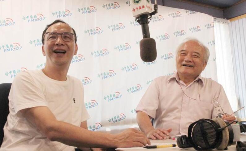 國民黨初選參選人朱立倫(左)接受電臺(tái)主持人文平(右)采訪。