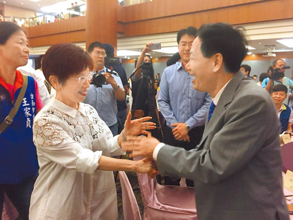 國(guó)民黨前主席洪秀柱(前左)到臺(tái)南出席林燕祝之友會(huì)餐會(huì),受到許多鄉(xiāng)親打氣加油。(圖片來(lái)源:臺(tái)灣《中國(guó)時(shí)報(bào)》)
