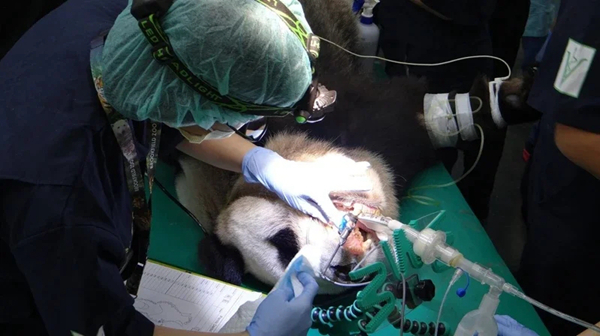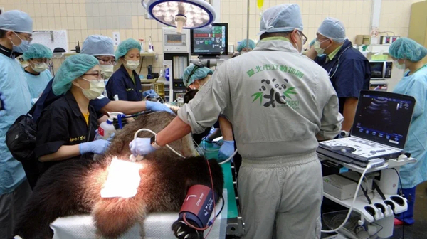 大熊貓繁殖工作小組為團(tuán)團(tuán)圓圓進(jìn)行人工授精。(圖片來源:臺北市動物園)