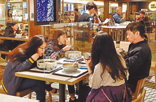 新冠肺炎疫情未歇,清明假期民眾到百貨美食街消費(fèi),有業(yè)者在用餐座位區(qū)使用透明隔板安全區(qū)隔。(圖片來源:臺(tái)灣“中時(shí)電子報(bào)”)