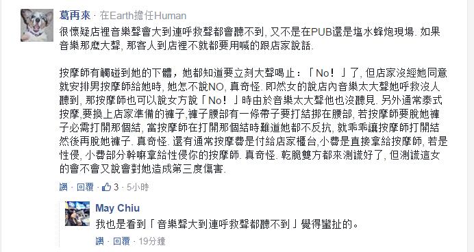 “他直接把我褲子脫掉就性侵我”,身為被害人的臺女在接受臺灣《東森新聞》訪問卻表示,她被按摩到一半就慘遭性侵,且店內音樂大聲,她的呼救完全沒人知道,還稱付錢給小費只是單純想快點離開,“(他說)我給他小費,是因為我滿意他服務,這我不能接受”。