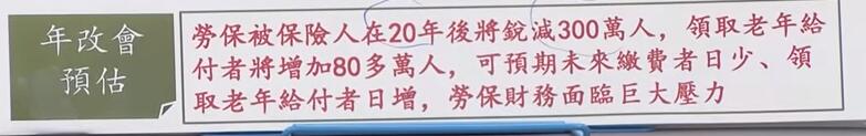 據臺灣有關部門最新一次勞保精算報告的統計,勞保基金會在今年入不敷出、2027年破產。但依“勞保局”統計,勞保基金去年一整年給付支出約3895億元(新臺幣,下同),但保費收入僅3633億元,整年度收支相抵為負262億元,較最新精算報告預測入不敷出的年份提早1年發生。若單看今年1到4月狀況,收支相抵合計也為負47.8億元。
