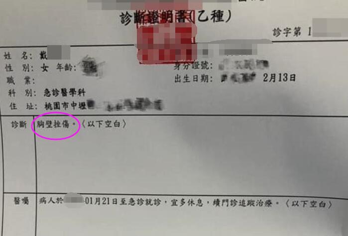 戴女表示,她當(dāng)下也因胸口疼痛、呼吸困難掛急診,這才檢查出胸骨錯(cuò)位、挫傷等,并請(qǐng)醫(yī)師開出驗(yàn)傷單;廠商之后也致電說(shuō)要包小紅包道歉,“當(dāng)下我以為是這位主持人要包紅包給我,所以才想說(shuō),對(duì)方既然有誠(chéng)意要道歉,那就算了”。