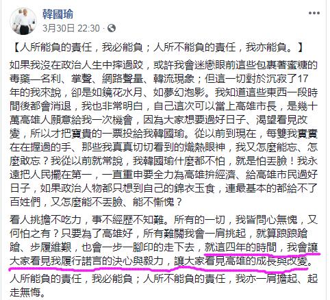 這里【插播】一則小消息:韓國瑜在接受質詢的前二天,曾在網上發了篇“小作文”,其中的一句話,引起了各方的不同解讀:“就這四年的時間,我會讓大家看見我履行諾言的決心與毅力,讓大家看見高雄的成長與改變”。