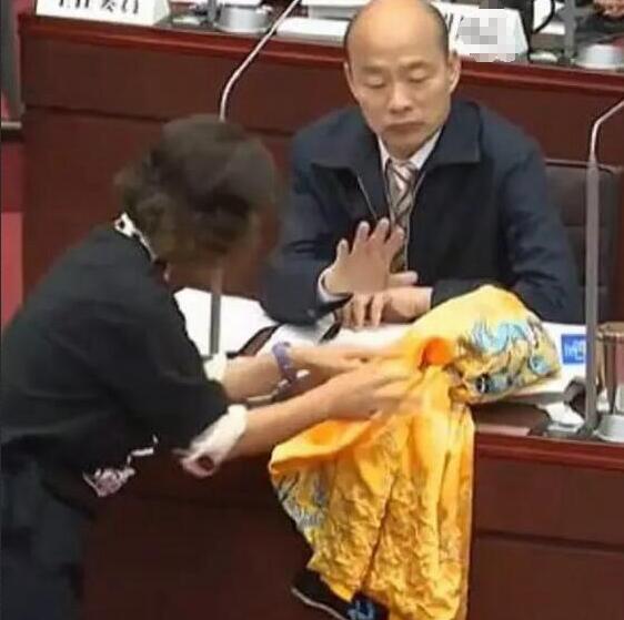 民進黨議員黃文義“先聲奪人”的表示,韓國瑜若想選2020,就該“像個男子漢一樣”,不要扭捏;接著按原劇本的發展,自顧自得為韓下定語——“你在等黃袍加身吧”。說罷,令人吃驚的一幕發生了:他與另一議員李喬如一起,拿出了一件繡著“龍紋”的黃袍,在韓國瑜面前展開,李更是雙手為韓國瑜“奉上大禮”!