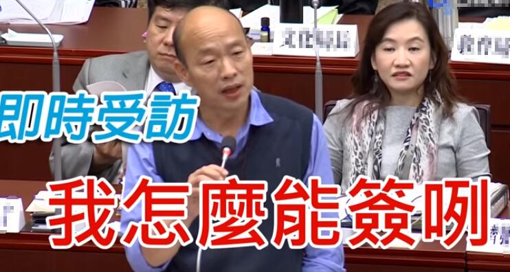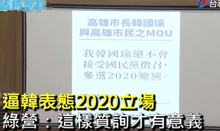 在2日的議會質詢時,更變本加厲的讓韓國瑜“簽字畫押”:要求身為市長的韓國瑜簽下一張與市民的備忘錄(MOU),內容為——“韓國瑜絕不接受國民黨征召,參選2020”。