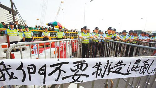 10月1日,占中人士匯集金紫荊廣場(chǎng)外圍,有民眾拉起“我們不要制造混亂”的布條。