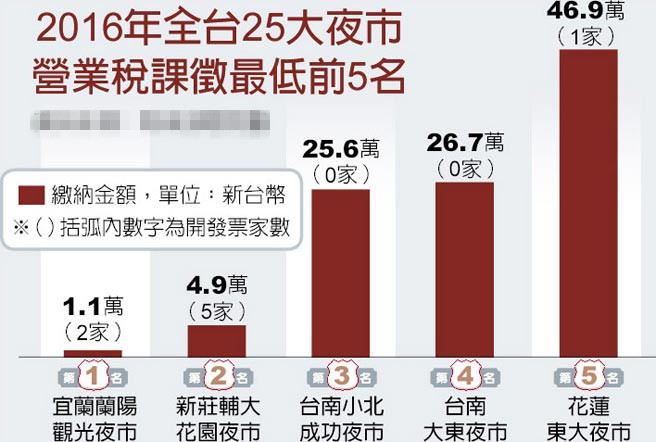 2016年全臺25大夜市營業稅課征最低前5名。(圖片來源:臺灣《中國時報》)