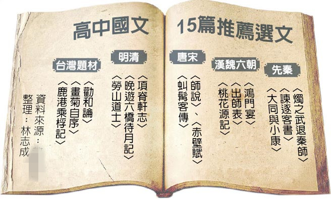 據臺灣《中國時報》報道,在10月15日的“課審大會”中,研修小組提出15篇推薦選文,“課審委員”對其中的《臺灣通史序》、《諫逐客書》及《鴻門宴》等多篇文章均有意見,因此決定昨天再討論一次,最后僅《臺灣通史序》被舍棄。